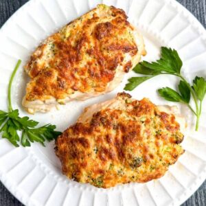 Two juicy baked chicken breasts topped with a golden, bubbly melted cheese layer mixed with bits of broccoli.