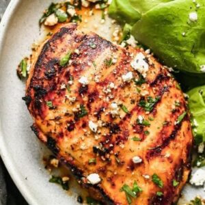 A juicy grilled chicken breast with beautiful char marks, glazed in spicy buffalo sauce, topped with crumbled blue cheese (or feta) and fresh chopped parsley.