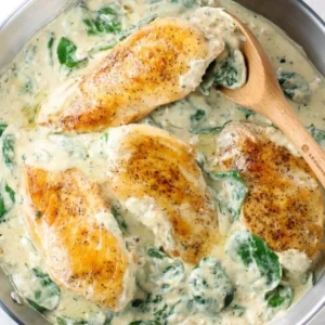 Golden seared chicken breasts nestled in a rich, creamy sauce loaded with fresh spinach leaves.