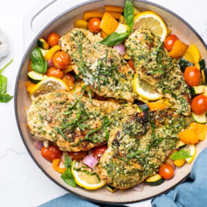 A vibrant one-pan dish with golden pesto-crusted chicken breasts surrounded by colorful roasted veggies like cherry tomatoes, zucchini, bell peppers, and lemon slices, garnished with fresh basil leaves.
