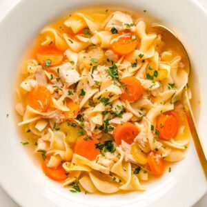 chicken noodle soup filled with tender chicken chunks, wide egg noodles, sliced carrots, and sprinkled with fresh green herbs. A spoon rests in the bowl, with a few crackers on the side. It looks cozy and delicious!