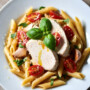 Vibrant green basil pesto coats tender chicken and pasta for a fresh, herby Italian classic.