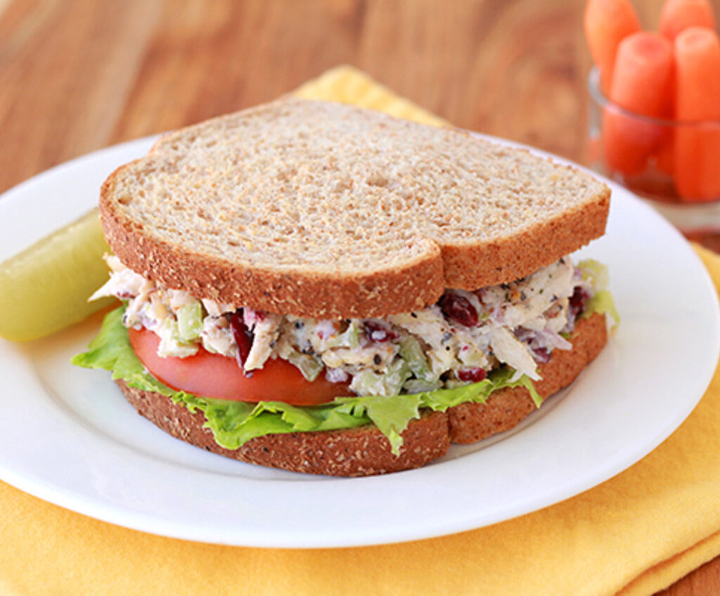 Chicken Salad Sandwich – Shredded boiled chicken mixed with Greek yogurt, celery, and herbs on whole wheat bread.