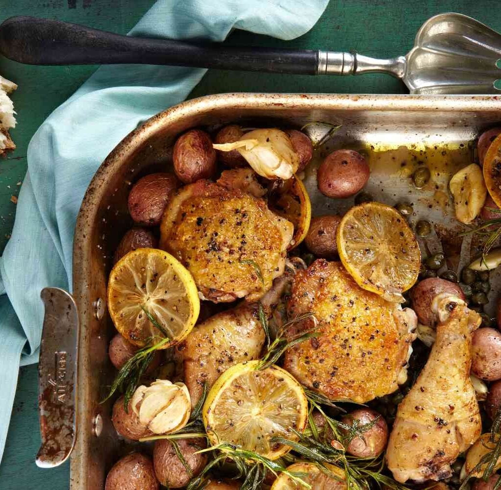 Preheat oven to 425 degrees. On a big pan, toss potatoes with half the oil, salt, pepper, and some rosemary. Put chicken on top. Rub chicken with rest of oil, garlic, and rosemary. Bake 30 to 40 minutes, stirring potatoes halfway.