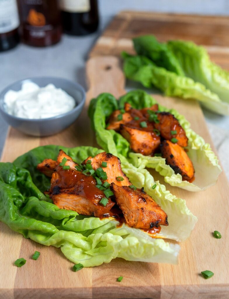 Spicy kick without guilt. Coat baked or grilled chicken in low-cal buffalo sauce (Frank’s + Greek yogurt). Wrap in lettuce leaves with celery and carrots. About 200 calories for two wraps. Cool ranch dip from yogurt optional.
