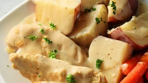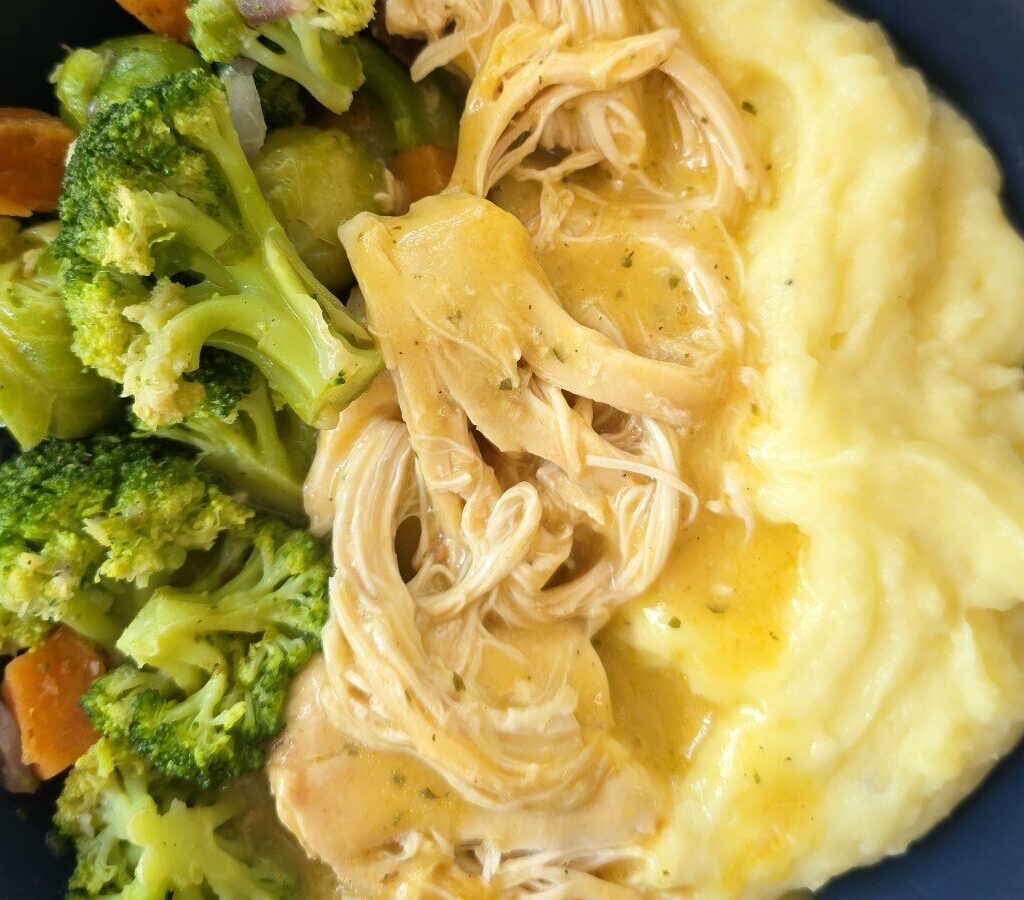 Ranch seasoning, broth, and cream cheese create a rich and comforting dish.