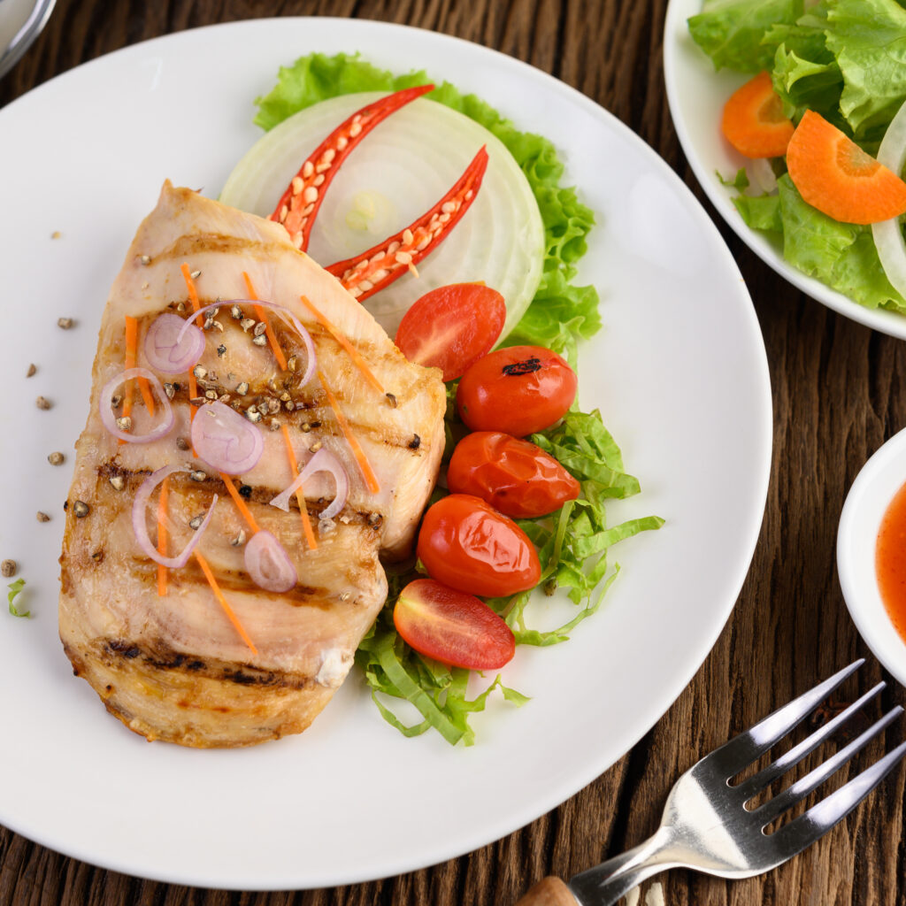 Thin-sliced chicken breast is high in protein and low in carbohydrates. It supports muscle growth and weight management. Using minimal oil keeps the calorie count low while maintaining flavor.